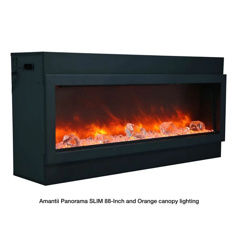 Amantii Panorama SLIM 88-Inch Built-in Indoor/Outdoor Electric Fireplace is the perfect solution! This stylish electric fireplace is 88″ wide and only 6 3/4″ deep, so it fits easily into any space – indoors or out. Plus, you can easily change the flame color from red to orange or yellow with just the click of your remote control.