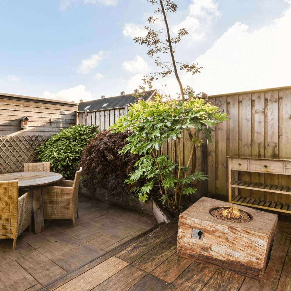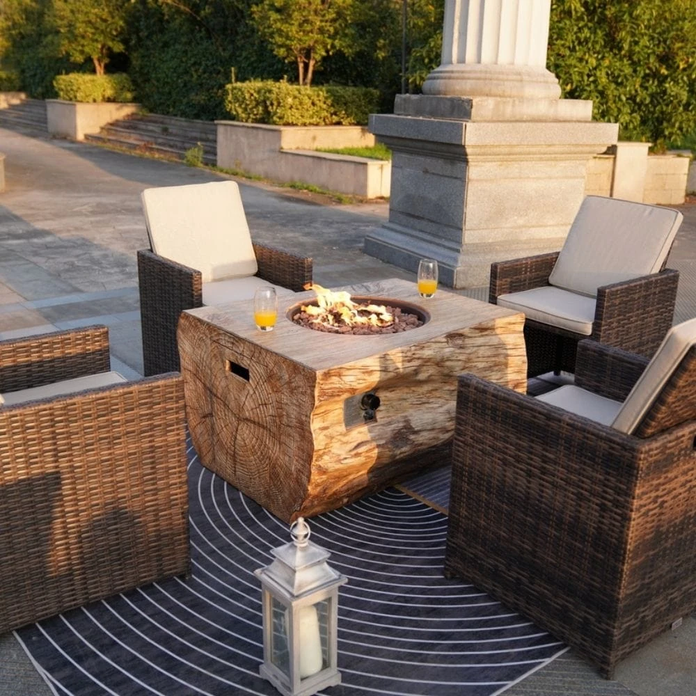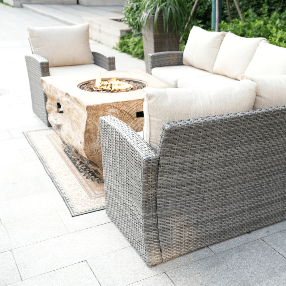 Direct Wicker 40-Inch Rectangle “Wood Grain” LP Fire Pit Table is the perfect solution. It is constructed from an iron ore and glass fiber concrete mix. It comes with a burner and rain cover to ensure it lasts for years.