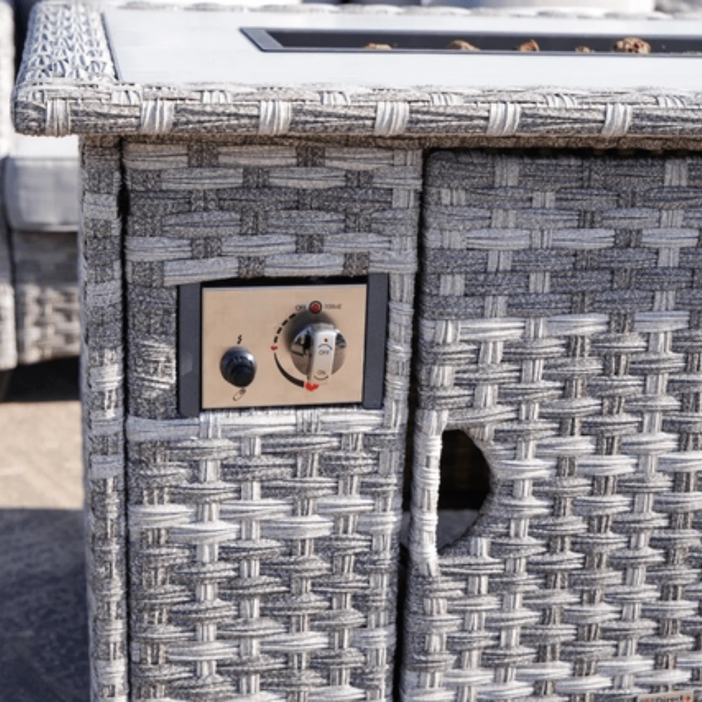 - Gray Wicker Set with love seat, armchairs, fire pit table, and a matching side table for your comfort
