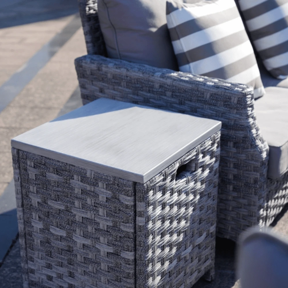 With this Direct Wicker Amora 5-piece Furniture Set, you can have all the comfort of cushioned seats with the added bonus of a cozy fire table. Plus, the fire table is easily adjustable to get the heat just right to keep you warm on even the coolest summer nights.