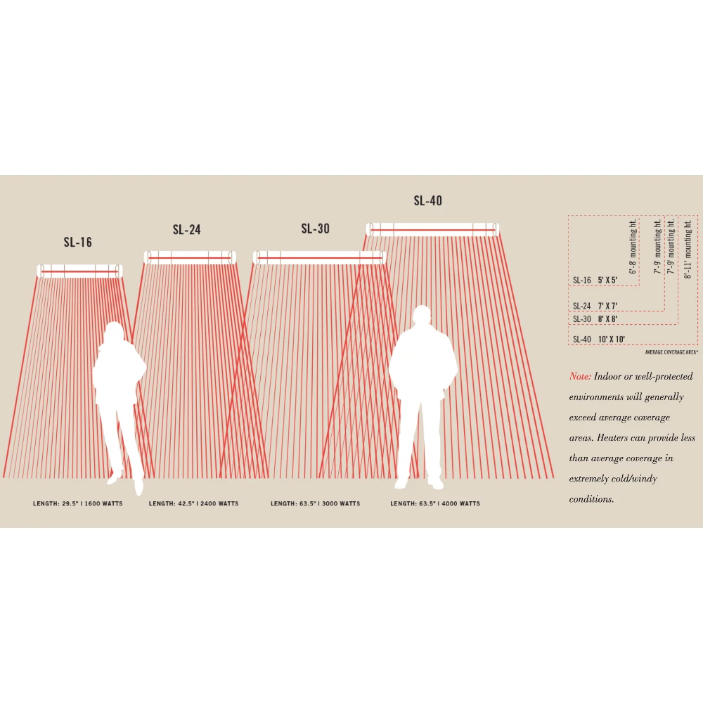 Select between a silver or black finish to match any decor. With proper mounting and mild weather, this electric patio heater can cover a maximum area of 5 x 5 ft. For more information on heating coverage and setup recommendations, take a look at this helpful Infratech Heat Coverage Guide.