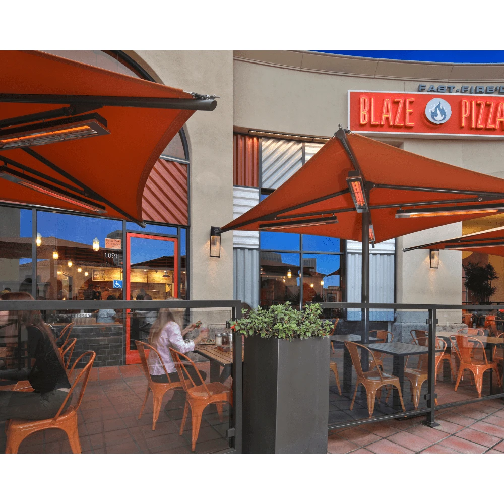 When properly installed, this electric patio heater heats a 5 x 5 ft area in mild weather. For more information on heating coverage and setup recommendations, take a look at this helpful Infratech Heat Coverage Guide.