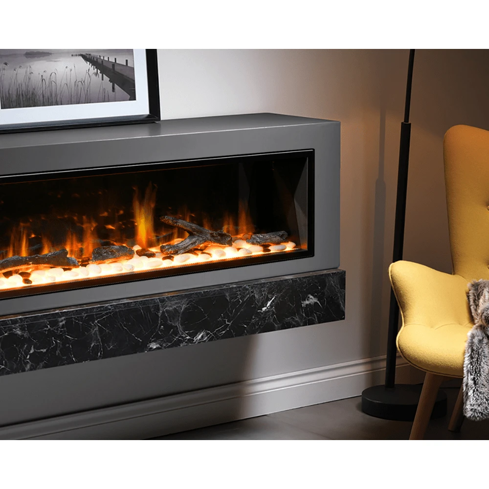 - Natural Stone Pebbles and a Driftwood Log Set come with the fireplace to enhance its look