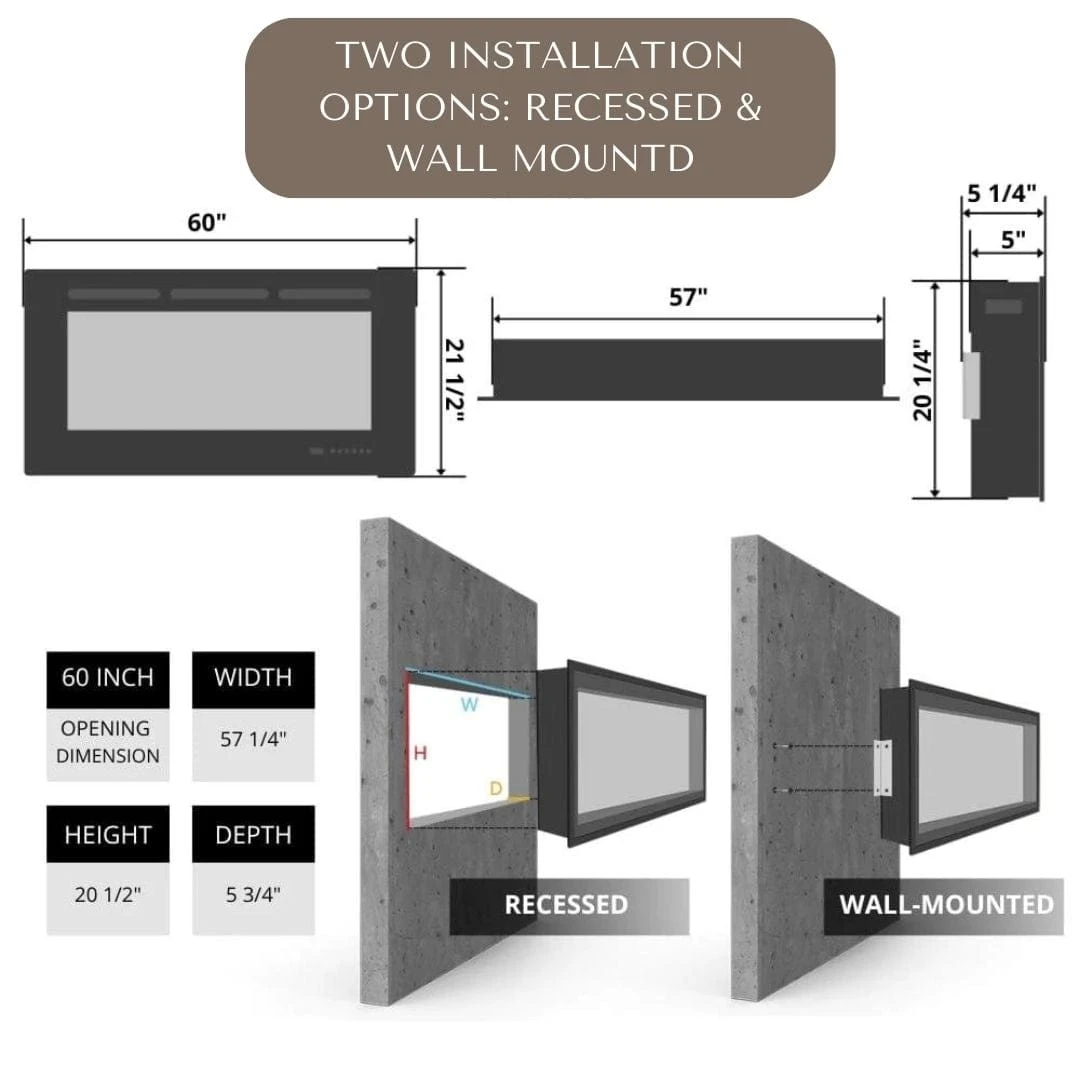 - 60″ Model:Â 20 1/4″ H x 57″ W x 5 1/4″ D