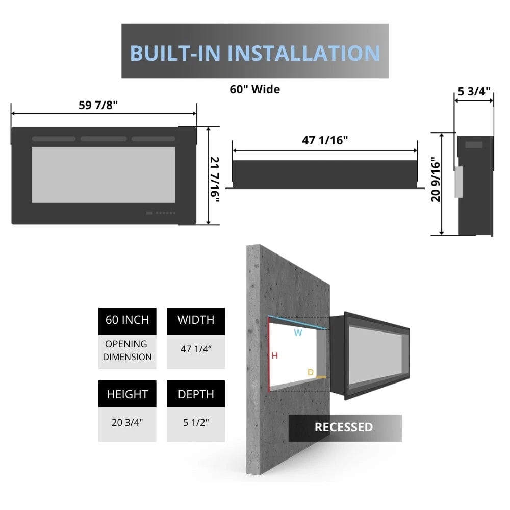 - The fireplace can be installed directly on the wall surface or fully recessed, based on your desired finished look
