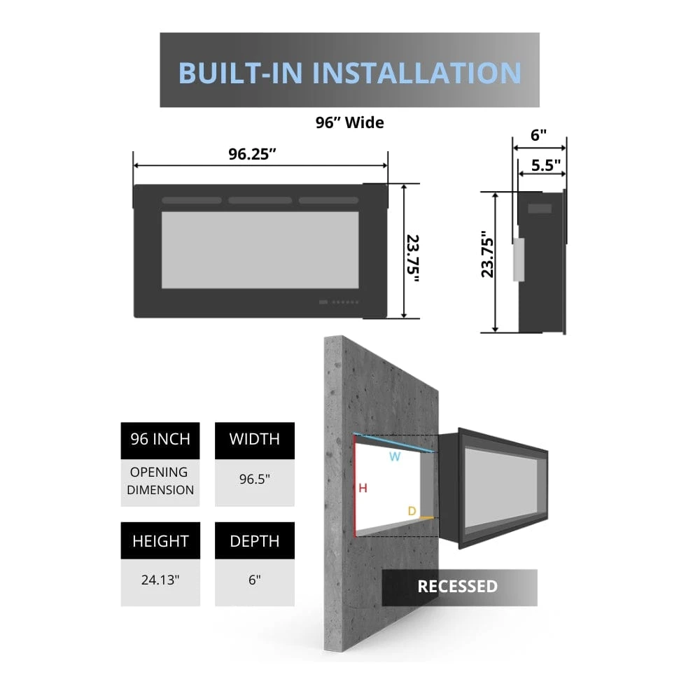 - Slim Electric Fireplace can be Fully Recessed in a 2″ x 6″ Wall
