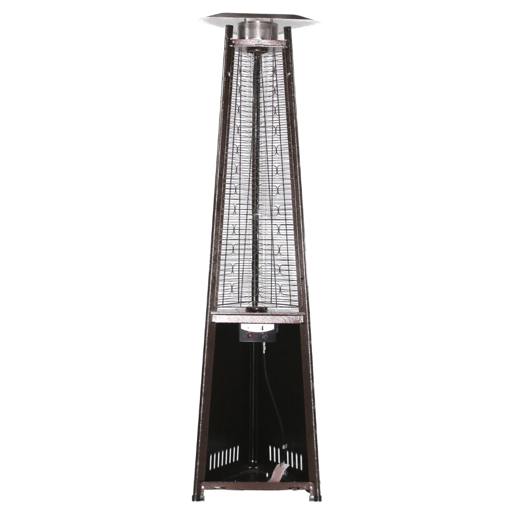 Give your outdoor space a romantic glow with a beautiful RADtec Pyramid Propane Patio Heater. This incredibly eye-catching fire feature stands tall at 93 inches in an Antique Bronze Finish with a triangle base. Its glass tube burner produces attractive flames that rise to the top and warm around 55 to 65 sq ft of space. The coverage area stays best heated with still winds and mildly cold temperatures.