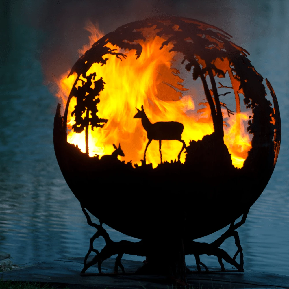 The Fire Pit Gallery Up North Fire Pit is designed to make you reminisce about the delight of a mountain retreat. Inspired by the woods up north, it features a family of deer and a Bull Moose, and a Craggy Tree or Flat Steel style for its base. It is a true masterpiece not many can just copy. As time passes, its surface creates a beautiful patina texture, adding more appeal to this already character-rich fire feature.
