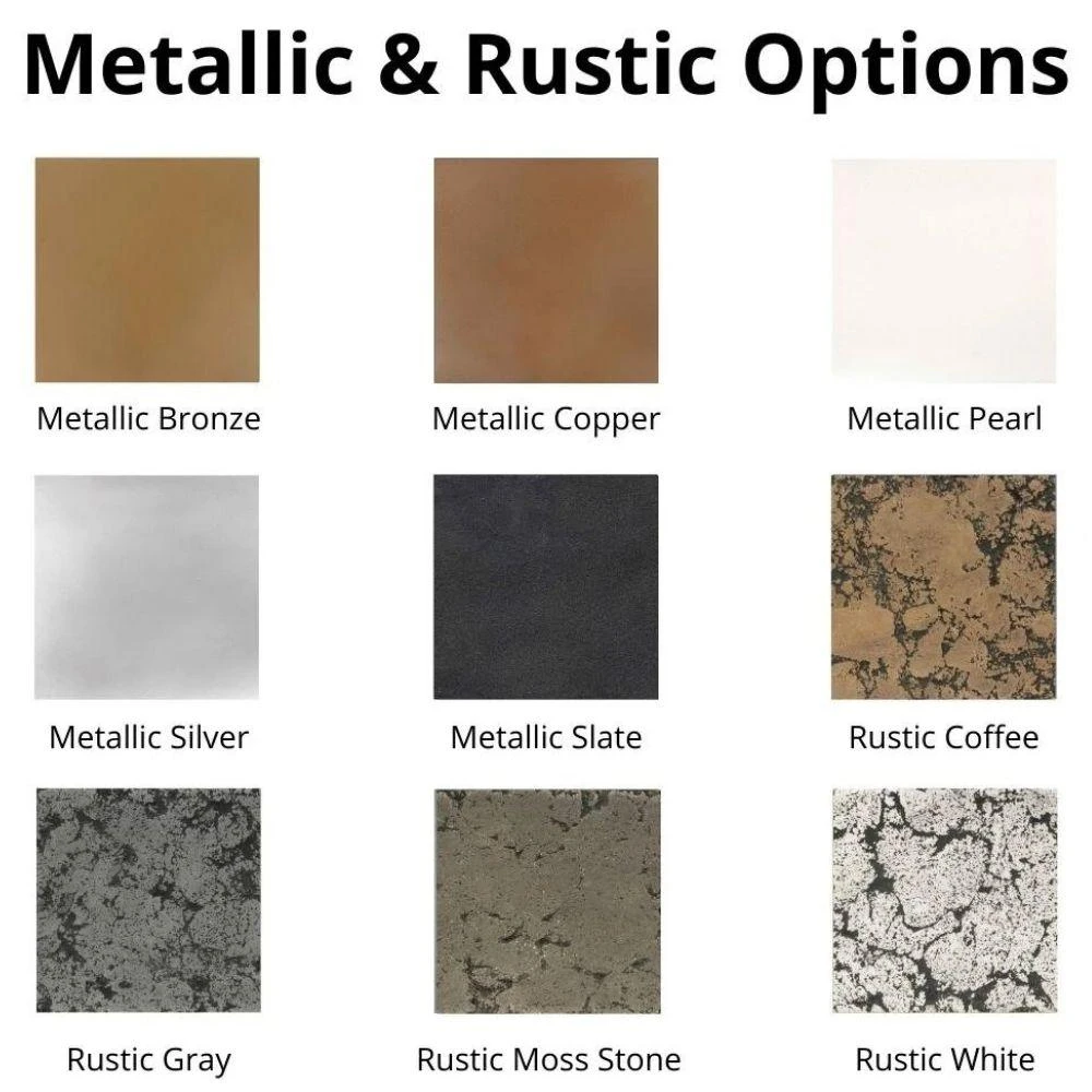 - 9 Premium Finish Options: Metallic Bronze, Metallic Copper, Metallic Pearl, Metallic Silver, Metallic Slate, Rustic Coffee, Rustic Gray, Rustic Moss Stone, Rustic White